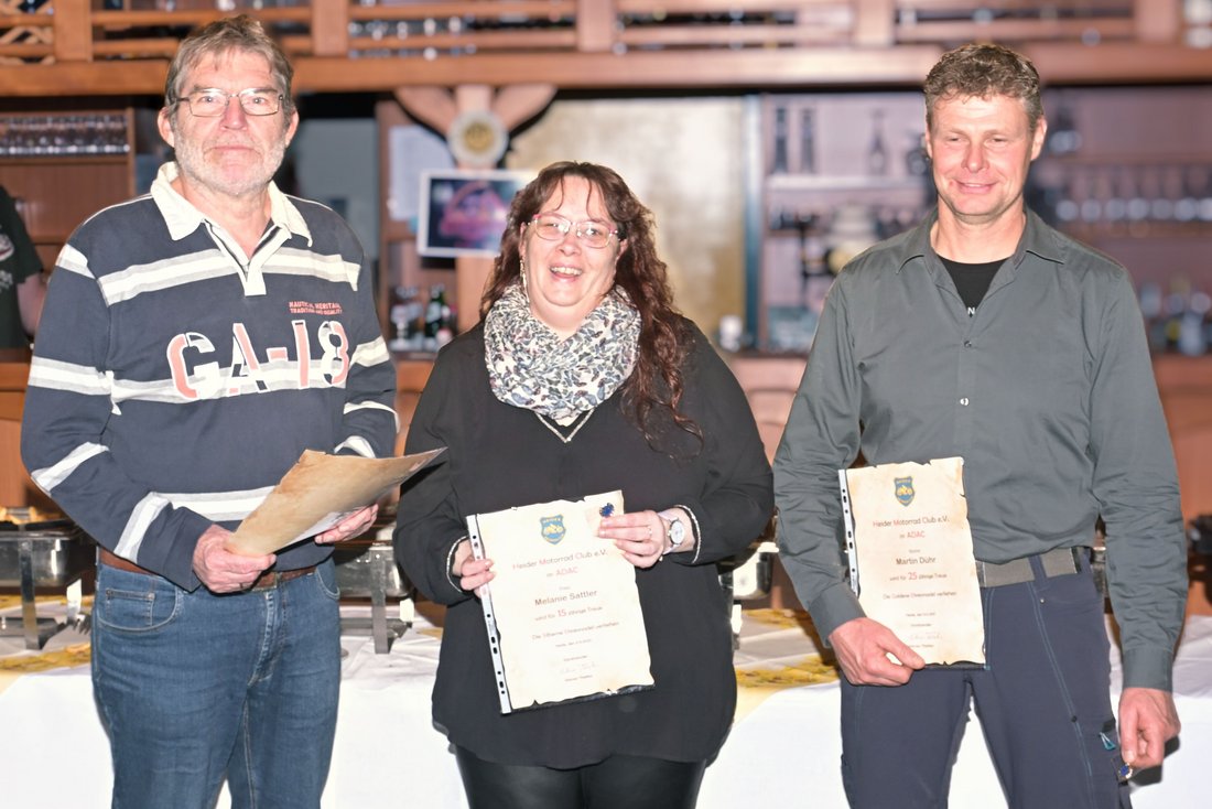 Im Rahmen seines Clubfestes ehrte der Heider Motorrad Club (HMC) im ADAC seine langjährigen Mitglieder und die erfolgreichsten Motorrad-Trial Fahrer des Jahres. Dazu konnte der Vorsitzende Werner Thießen zahlreiche Mitglieder und Gäste im Heider MTV Sportheim begrüßen. Nach einem schmackhaften Grünkohlessen erhielt Rutger Sacht die bronzene Ehrennadel und eine Urkunde für 10 jährige Mitgliedschaft, Melanie Sattler die silberne Ehrennadel mit Urkunde für 15 jährige Mitgliedschaft und Martin Dühr die goldene Ehrennadel mit Urkunde für 25 jährige Mitgliedschaft aus den Händen des Vereinsvorsitzenden überreicht.