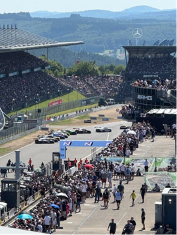 Vom Dach des Start-Ziel-Hauses hatten wir einen ausgezeichneten Blick auf die Start-Ziel-Gerade und die Grand-Prix-Strecke und erlebten nach der Einführungsrunde für die drei Gruppen einen phänomenalen Start des 24h Rennens pünktlich um 16:00 Uhr.